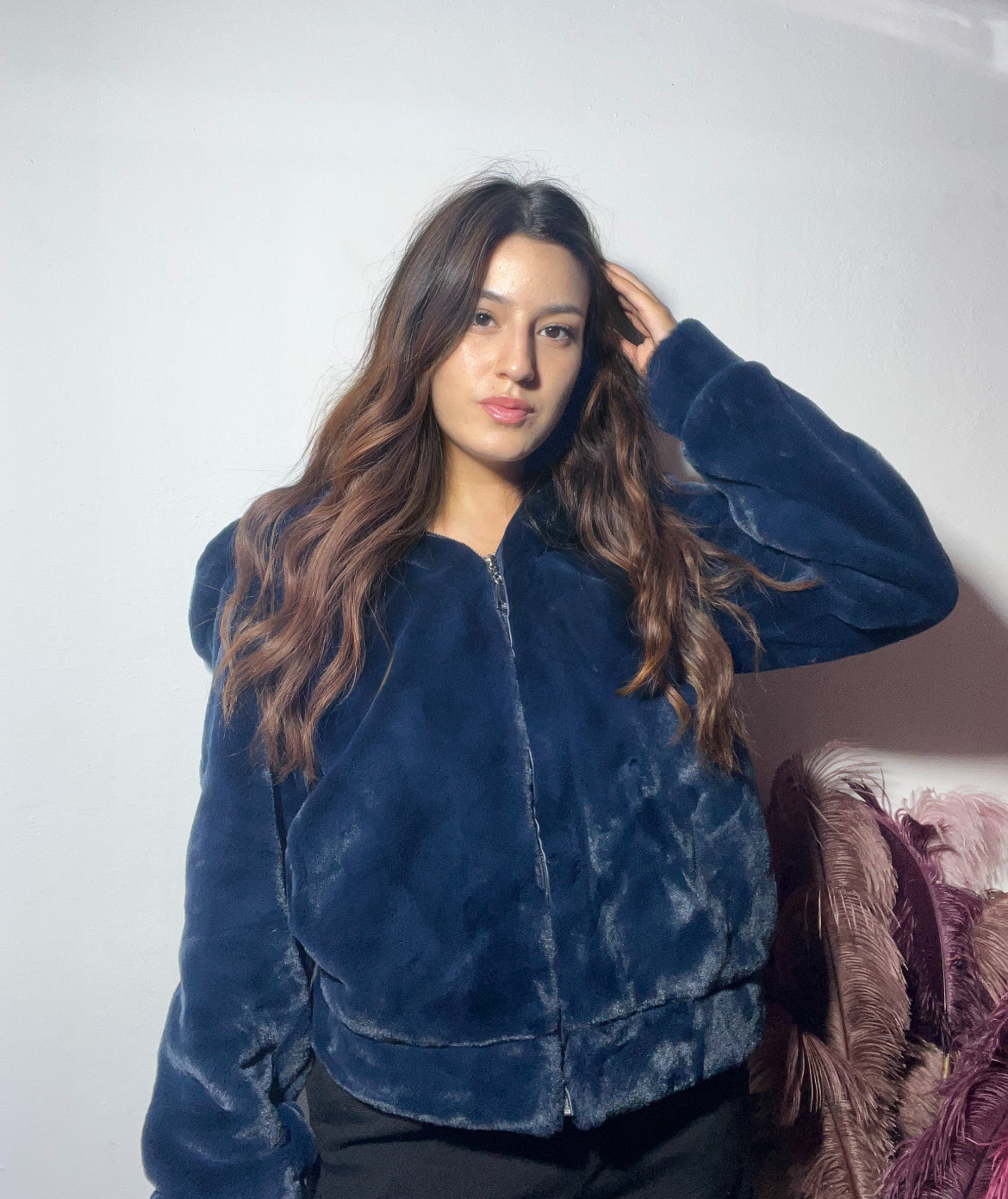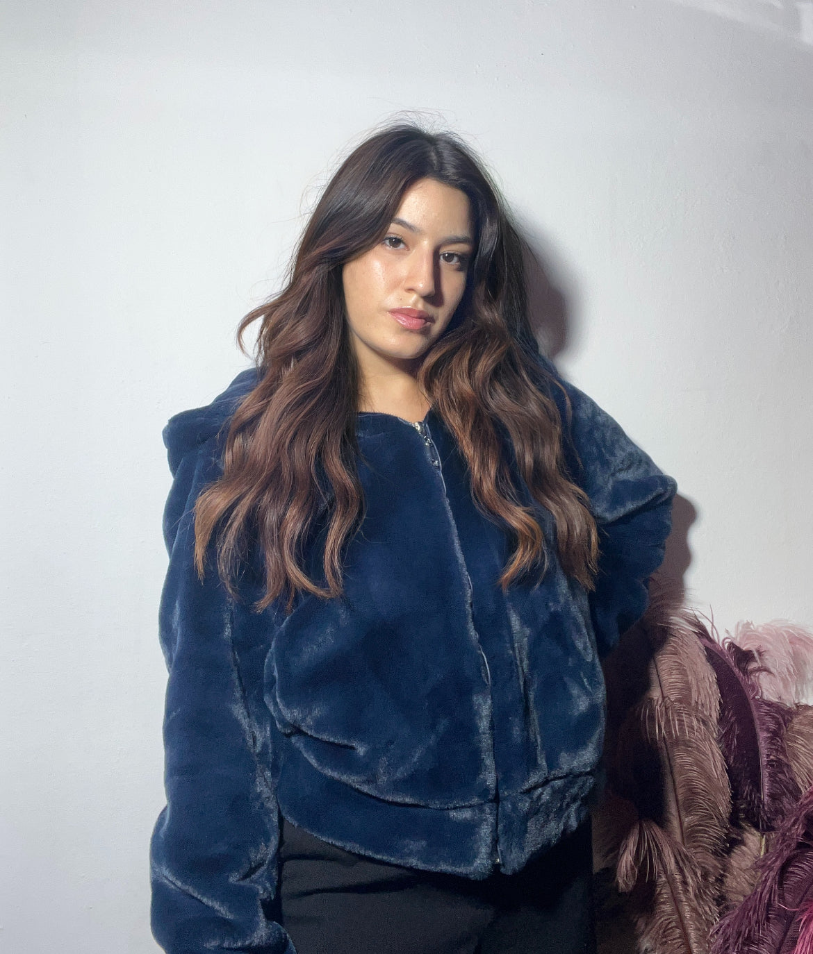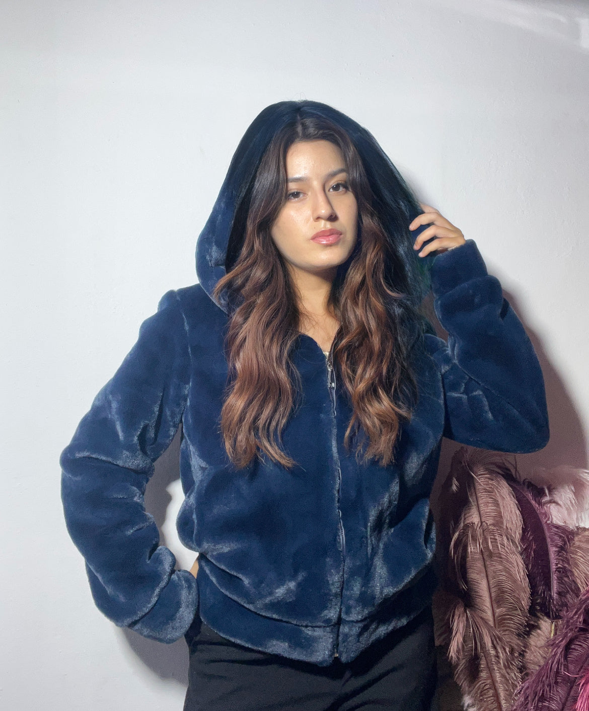 Pellicciotto blu, un capo morbido e caldo ideale per le giornate più fredde. Dotato di una pratica zip e di un cappuccio, unisce comfort e stile, rendendolo perfetto per un look casual e disinvolto