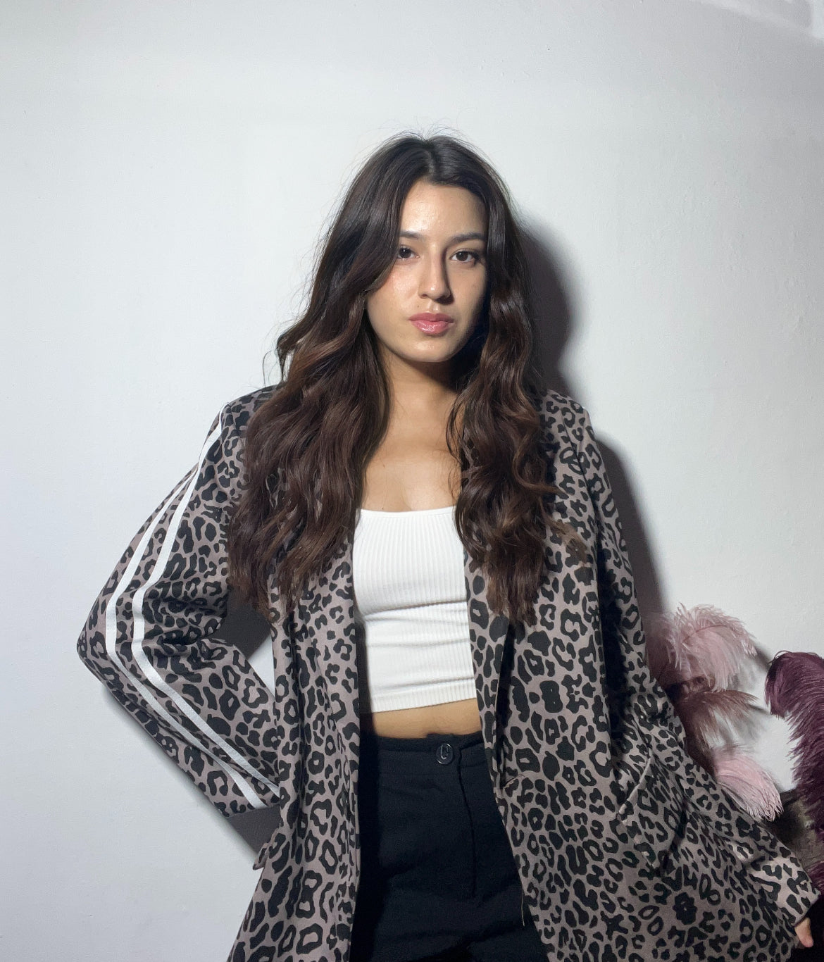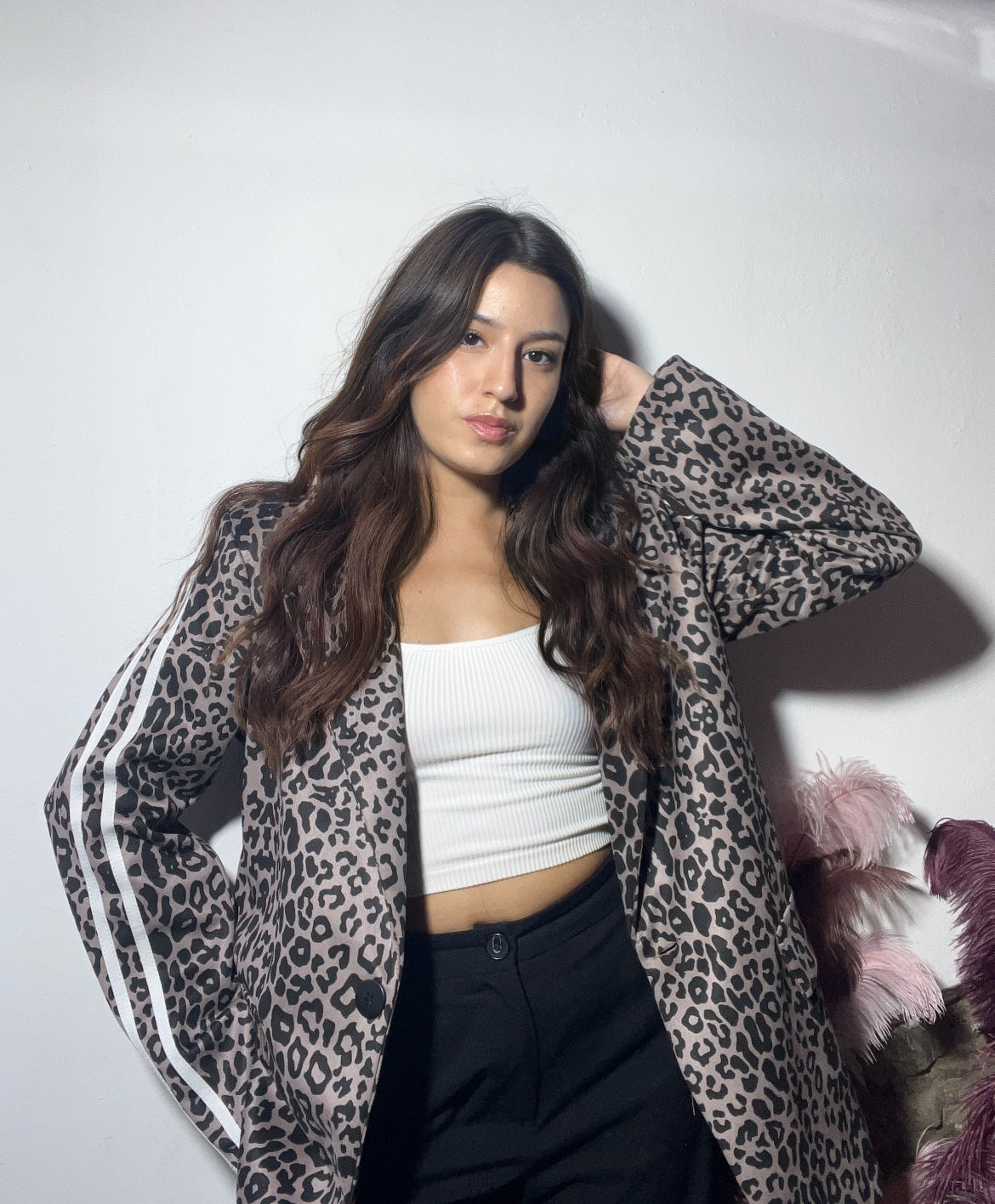 Giacca elegante con audace stampa animalier e un'originale striscia sulla manica che aggiunge un tocco moderno. Un capo di forte impatto, perfetto per chi desidera distinguersi con stile.