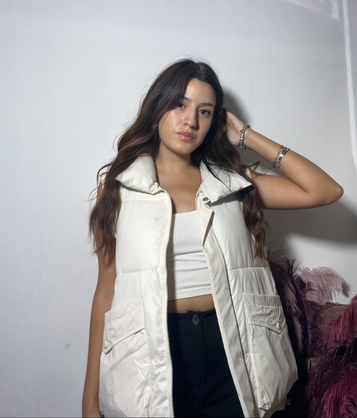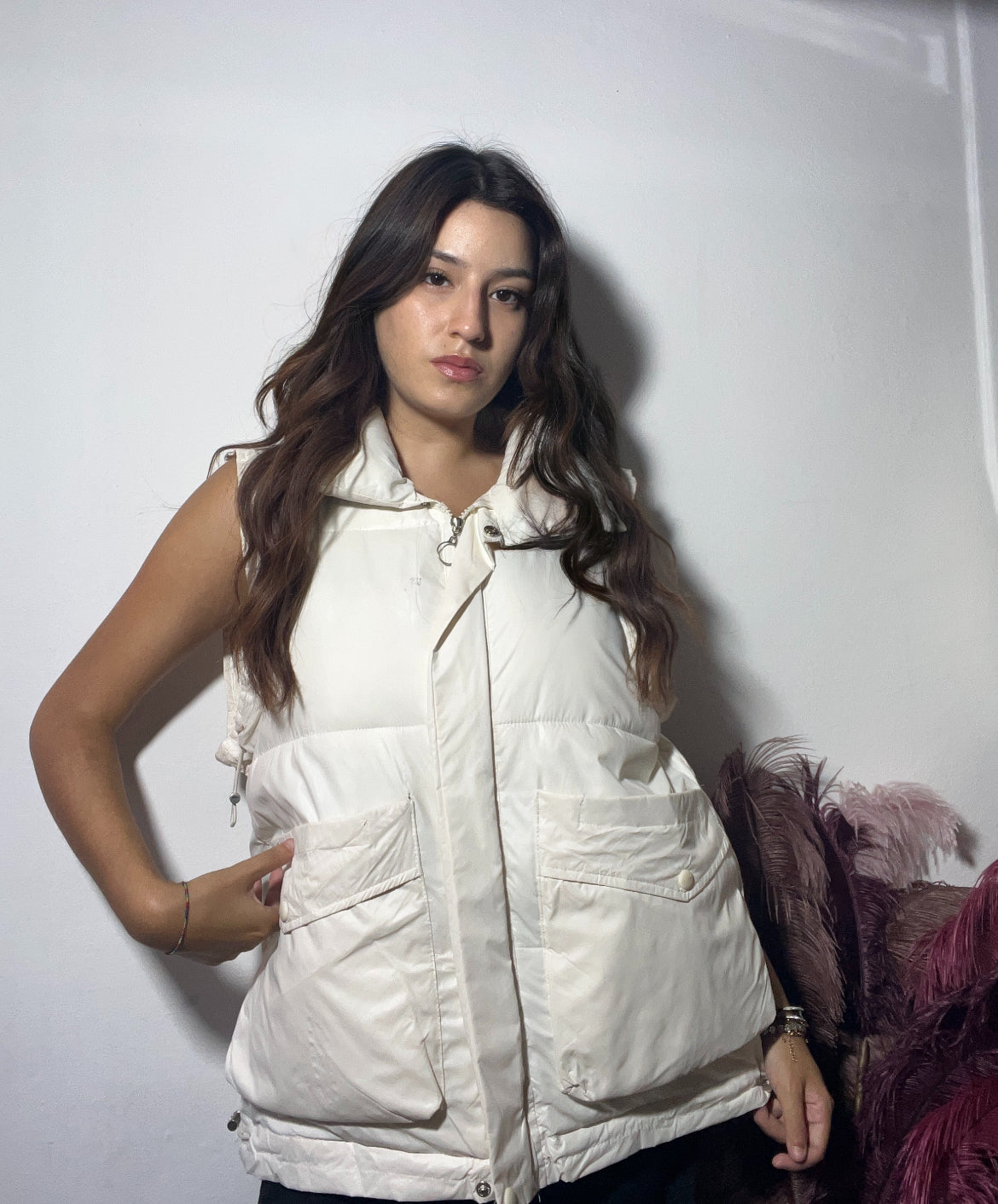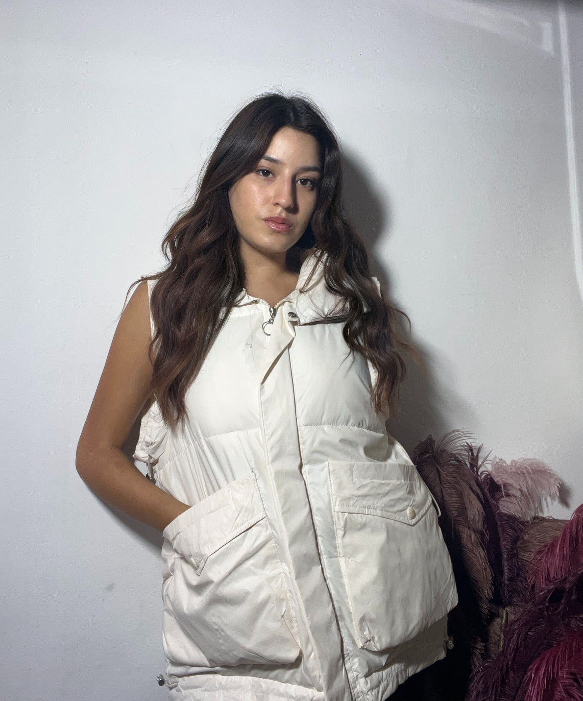Piumino smanicato color panna, un capo versatile e caldo. Il suo design minimalista e la tonalità neutra lo rendono perfetto per dare un tocco moderno a qualsiasi look, aggiungendo un comodo strato di protezione senza appesantire la figura.🫧