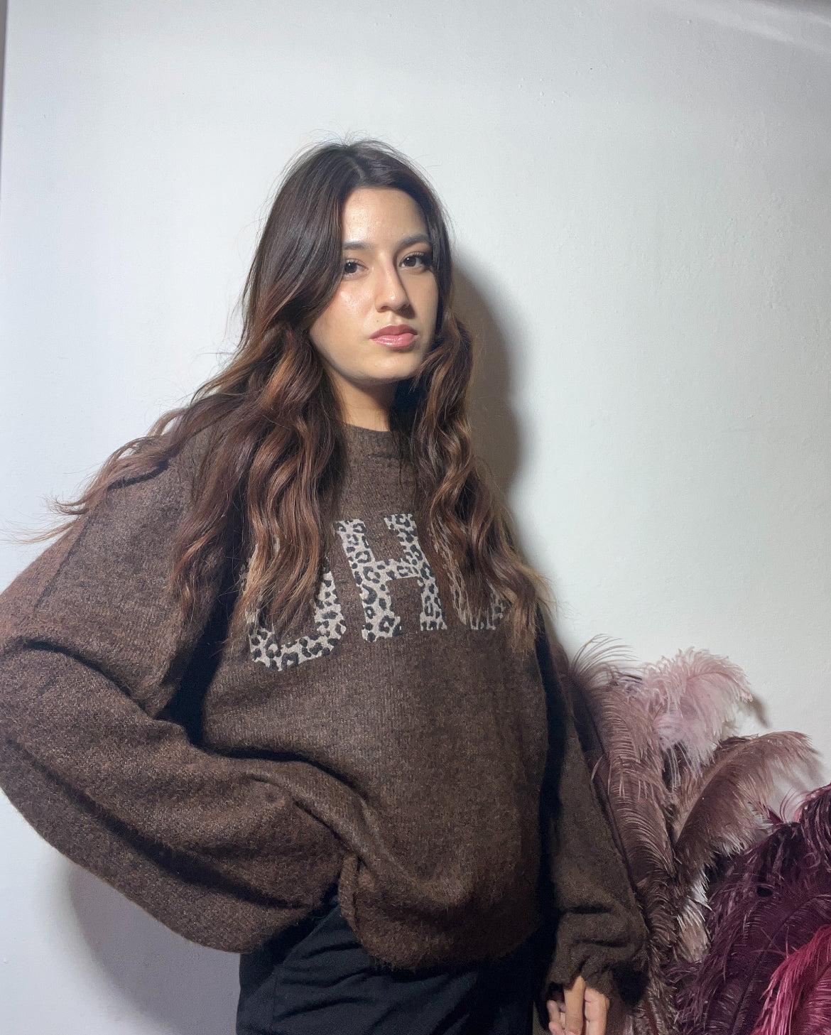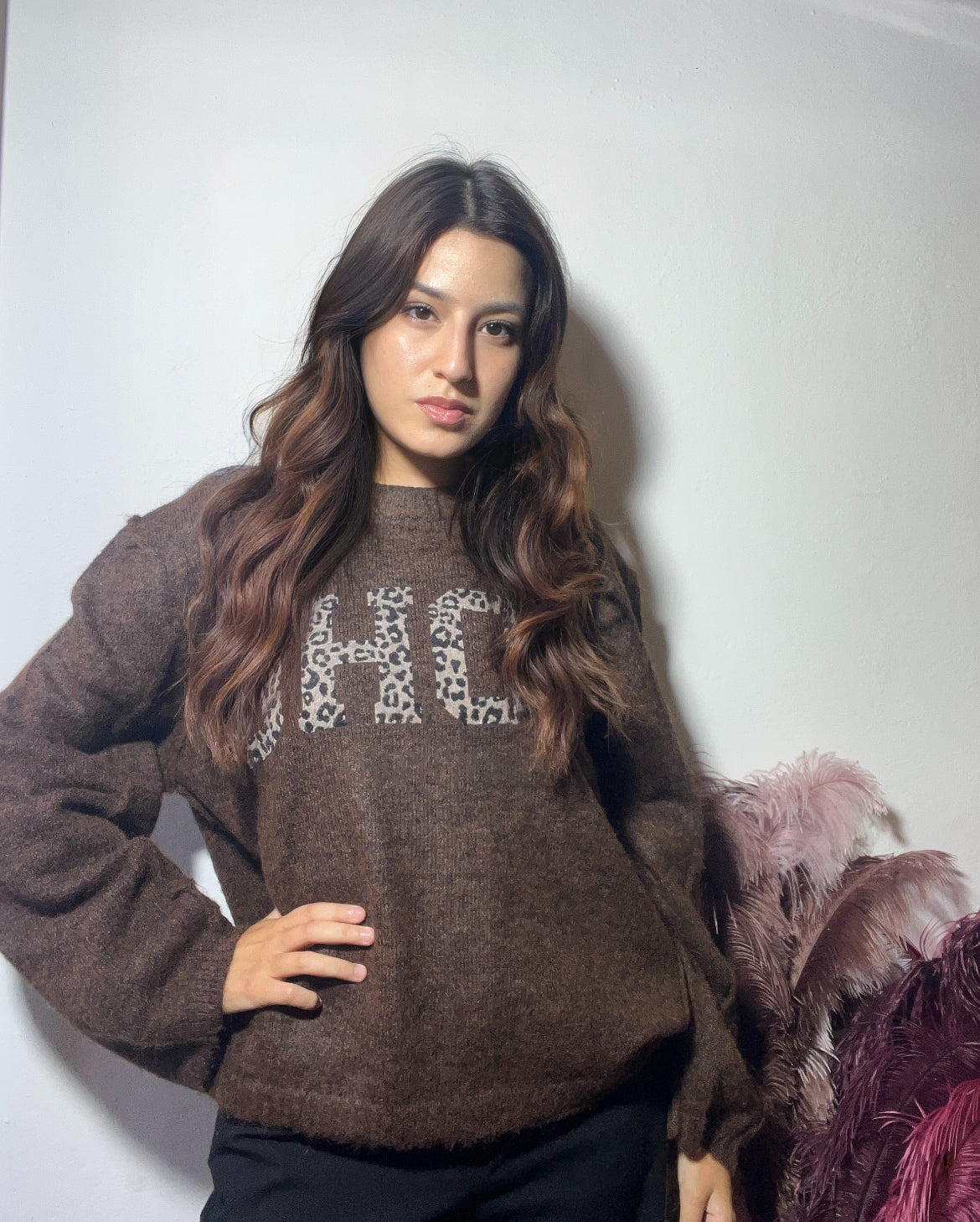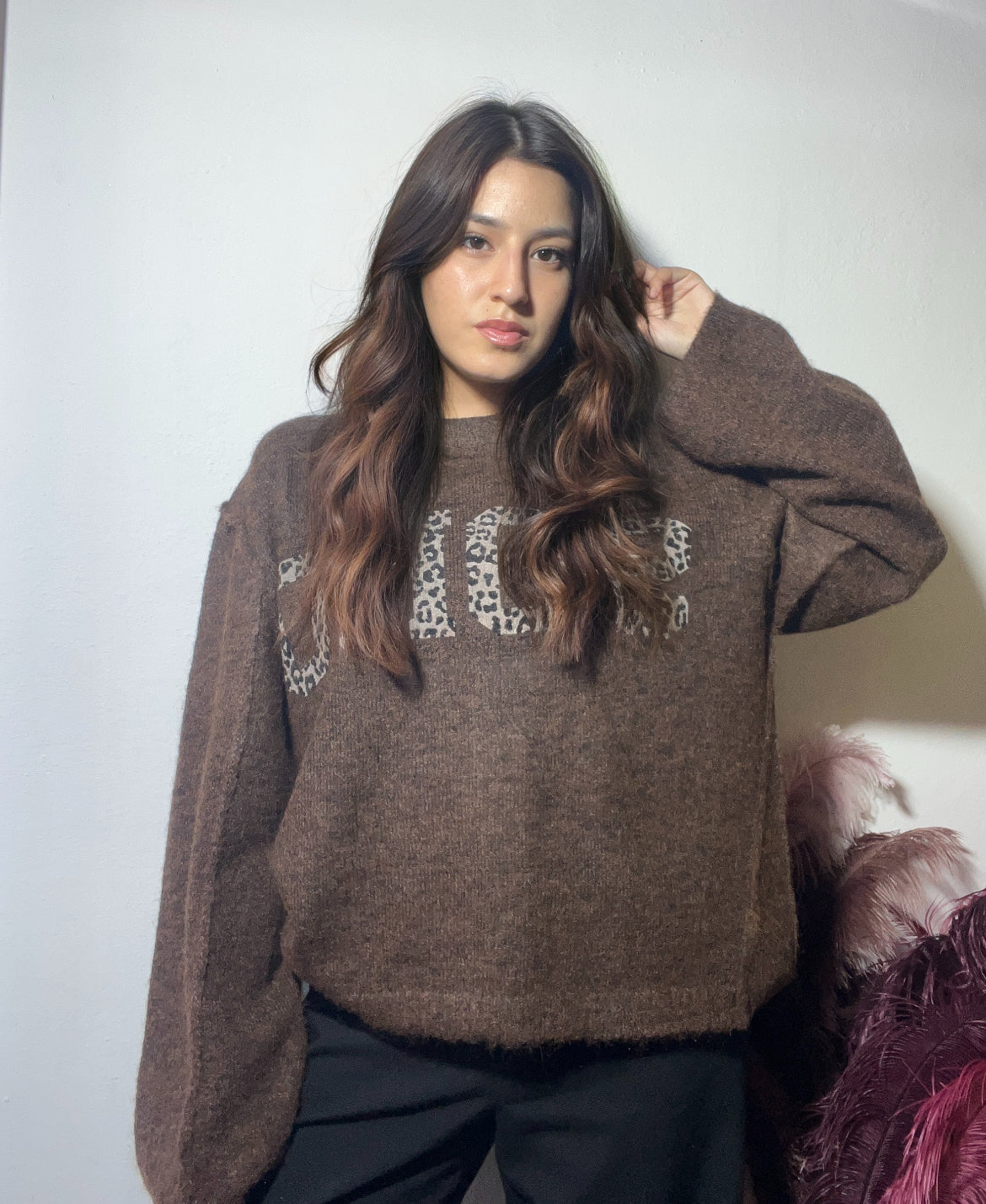 Maglioncino color cioccolato, caldo e avvolgente, perfetto per le giornate più fredde. Il suo tratto distintivo è la scritta in fantasia maculata che aggiunge un tocco audace e di carattere, rendendolo un capo comodo ma con una forte personalità