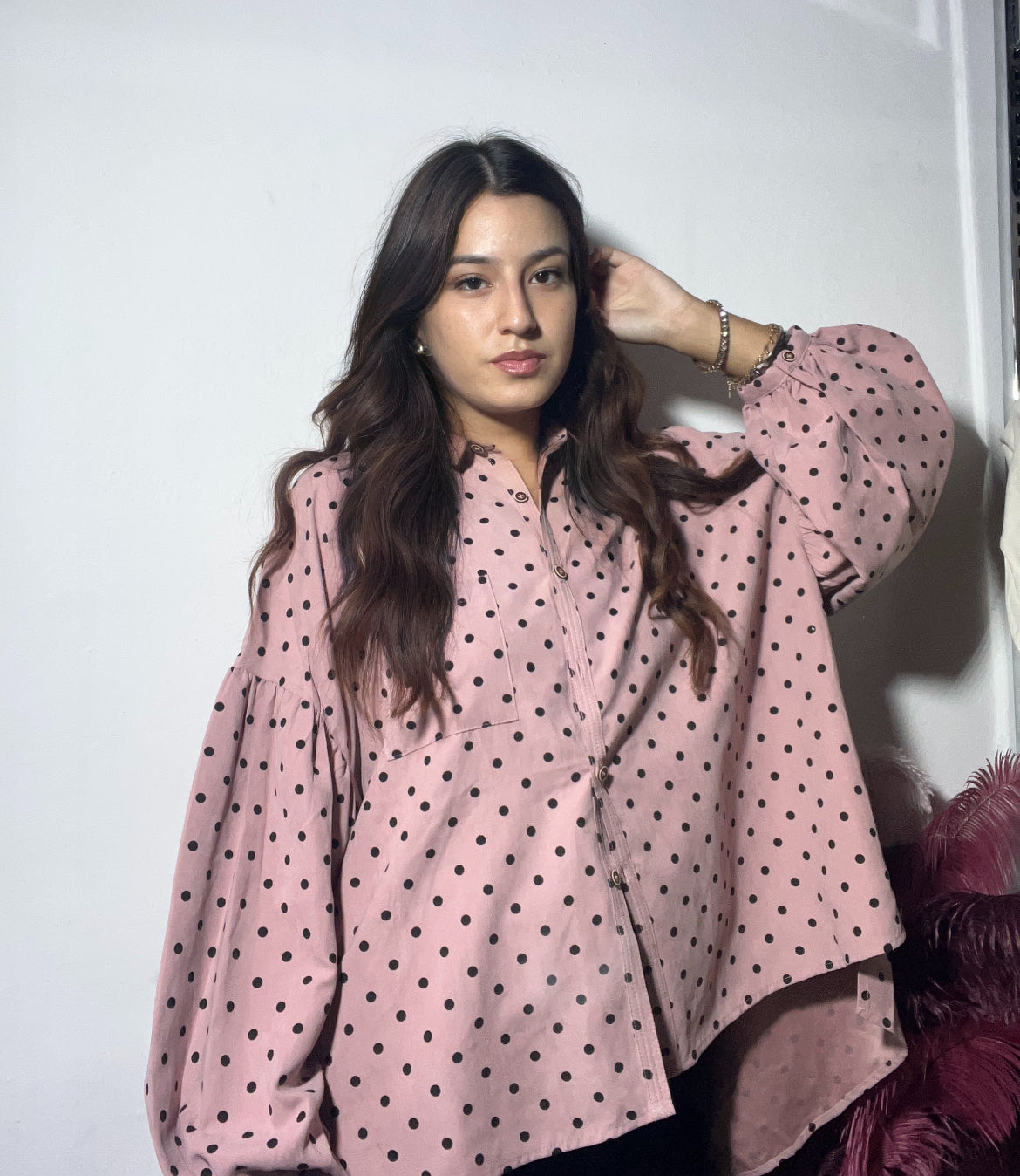 Una camicia rosa brillante a pois neri, con manica a sbuffo, che da un tocco audace e grintoso al look. Le maniche a sbuffo conferiscono un volume drammatico, creando un look vivace e di tendenza. Perfetta per chi ama osare.💌